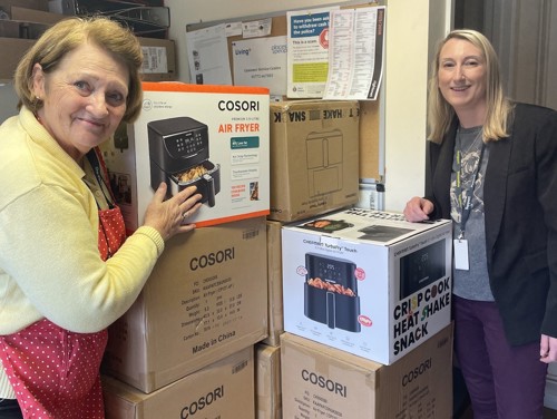PfP Customer Support Co-odinator Pat Turley and Social Value Project Co-ordinator Melanie Wigley with the air fryers for customers